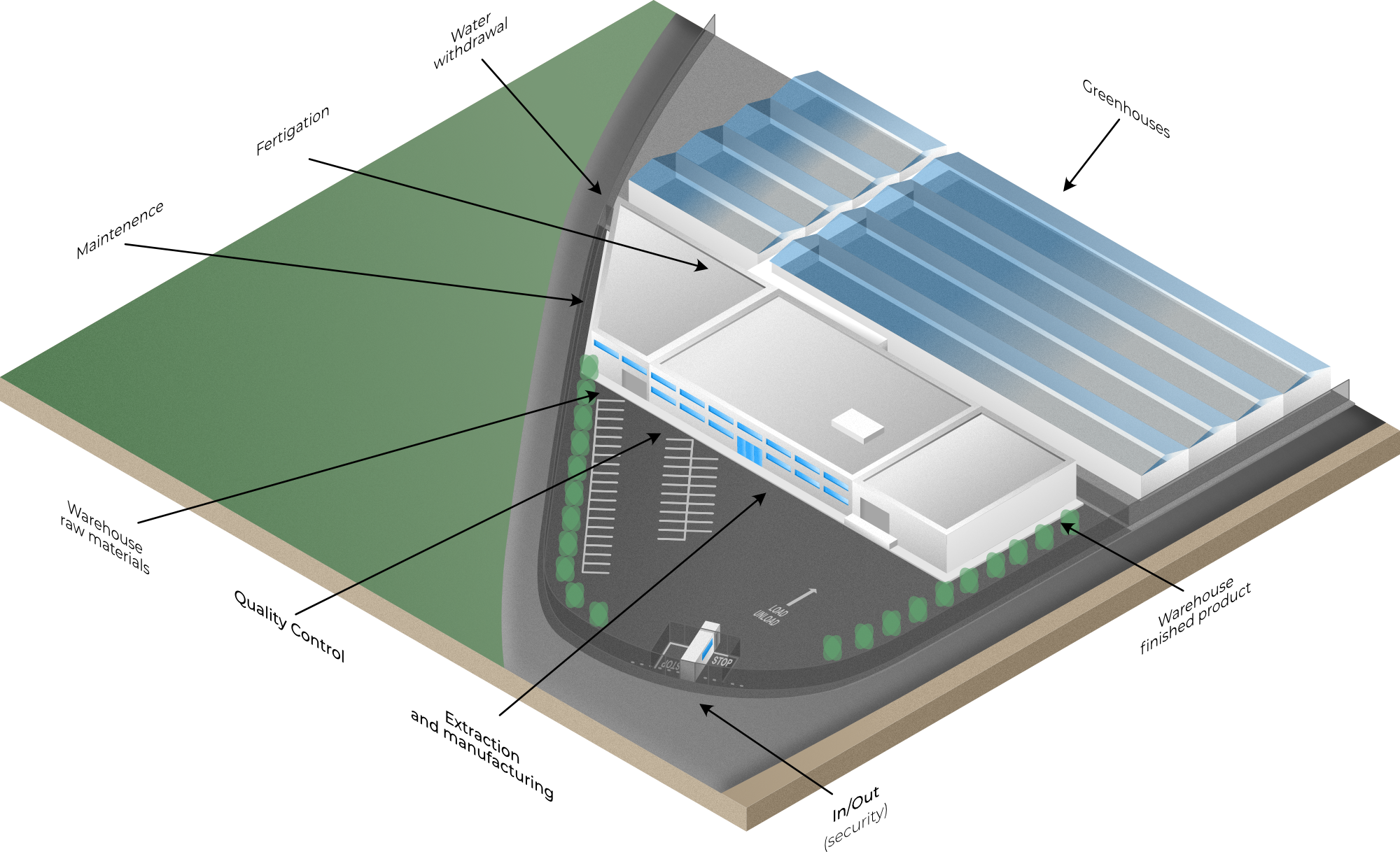 The development of the Factory, where the oil extraction by supercritical CO2 and the purification and separation of cannabinoids (particularly THC and CBD) and terpenes by chromatography, will complete the synergetic circle with the greenhouse and the outdoor cultivation, promoting an increase in production efficiency, and improving conditions for subsequent commercial negotiations.